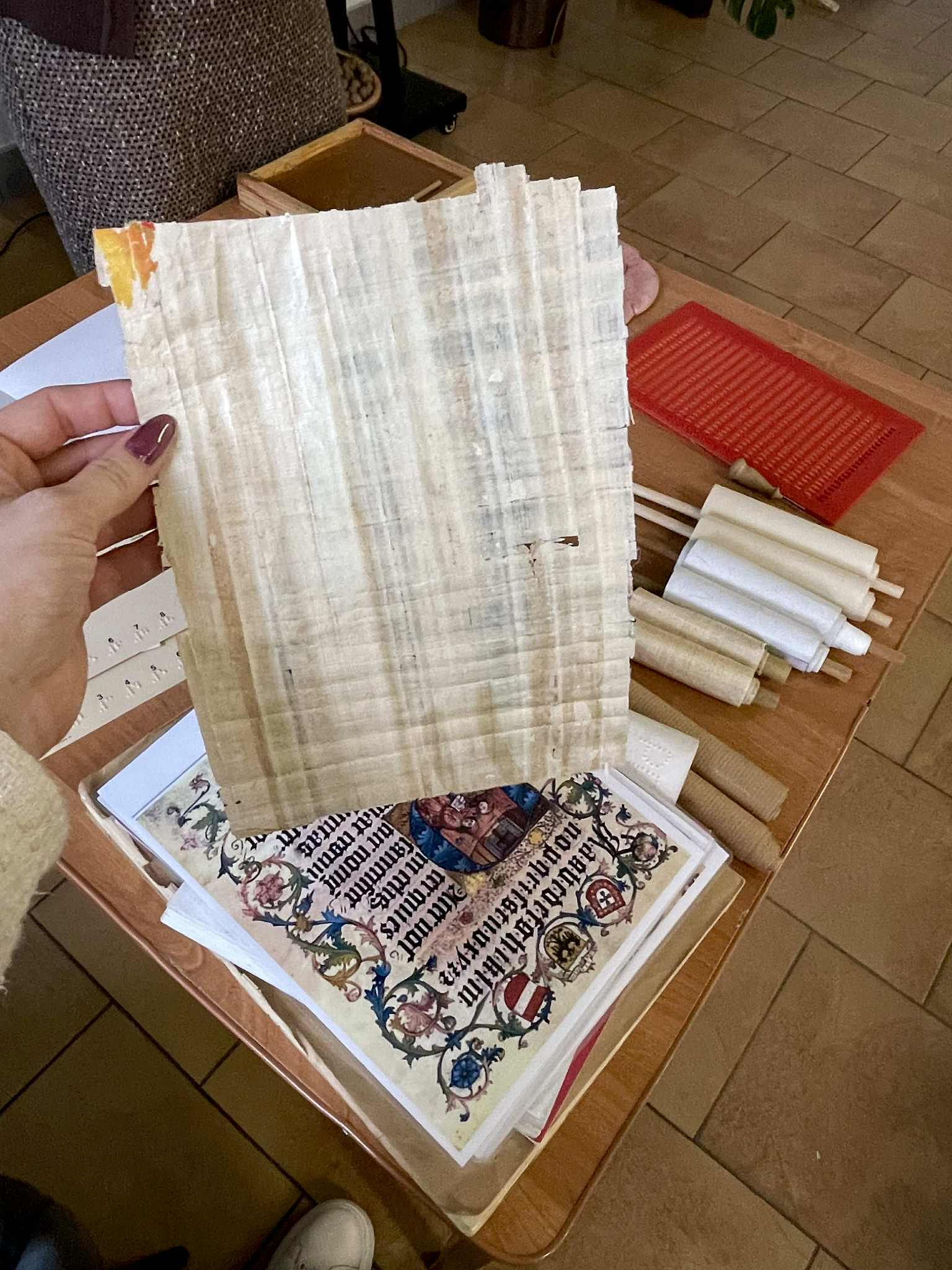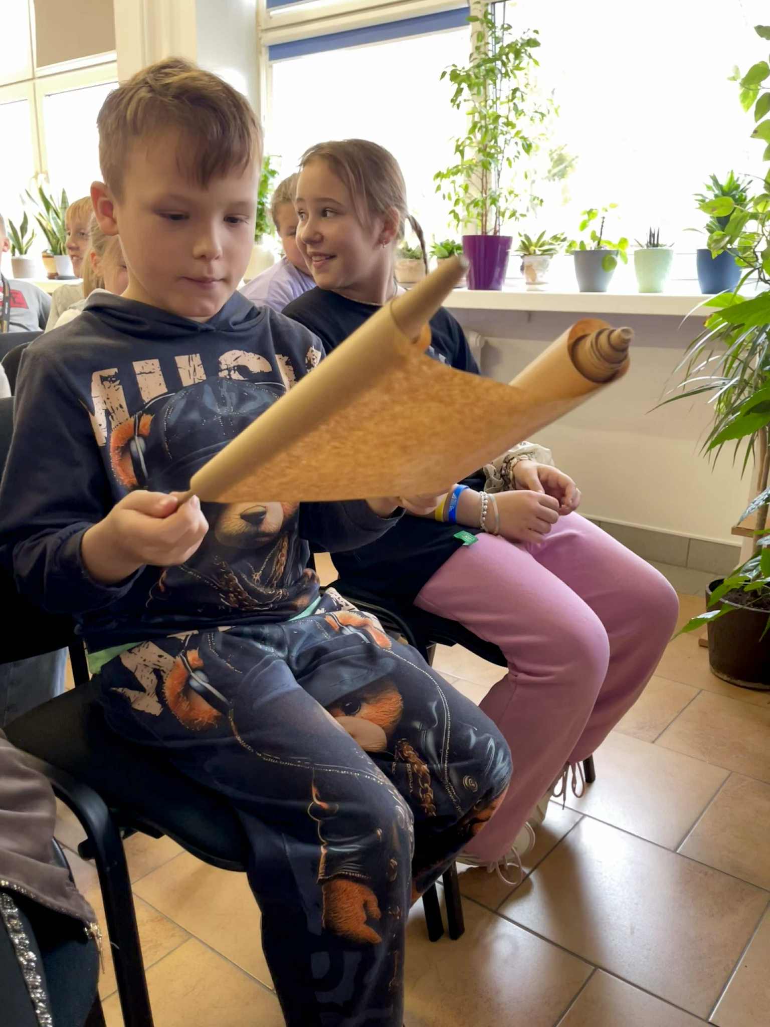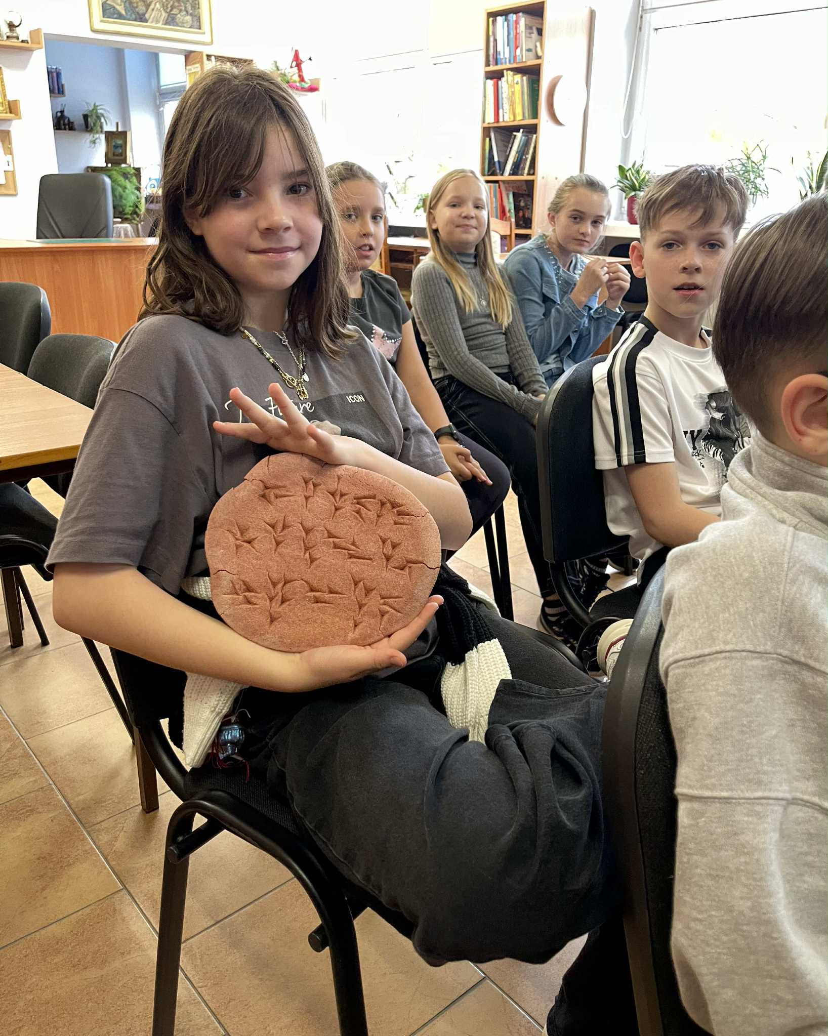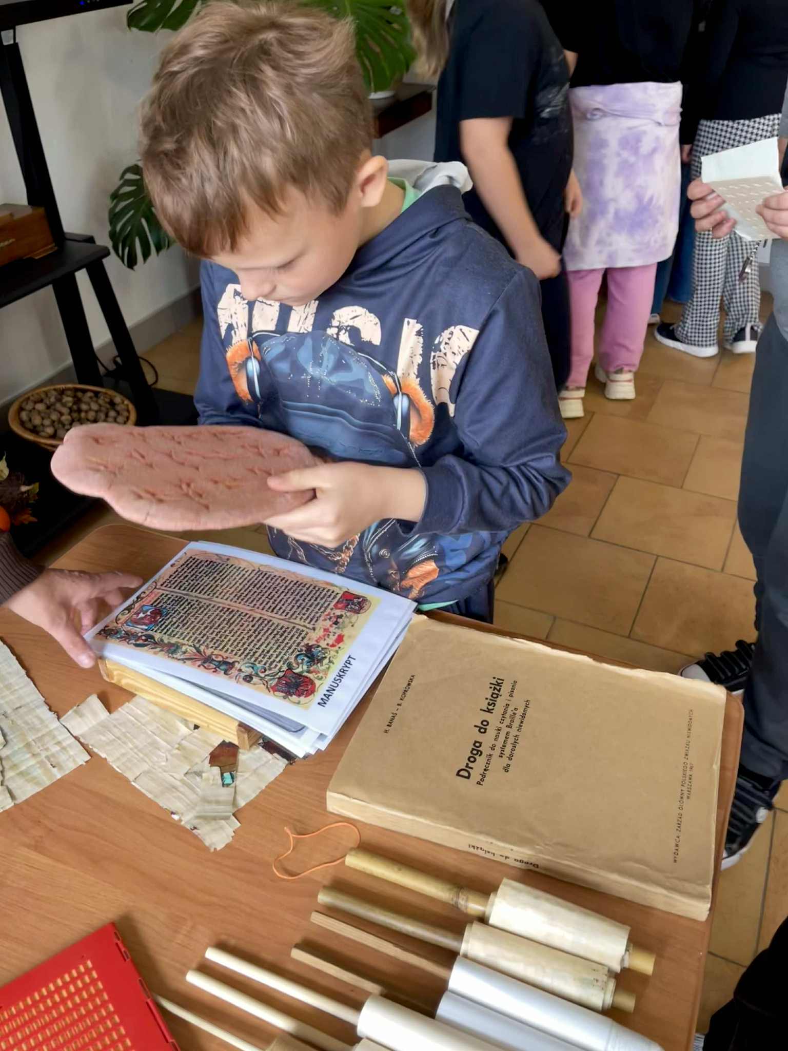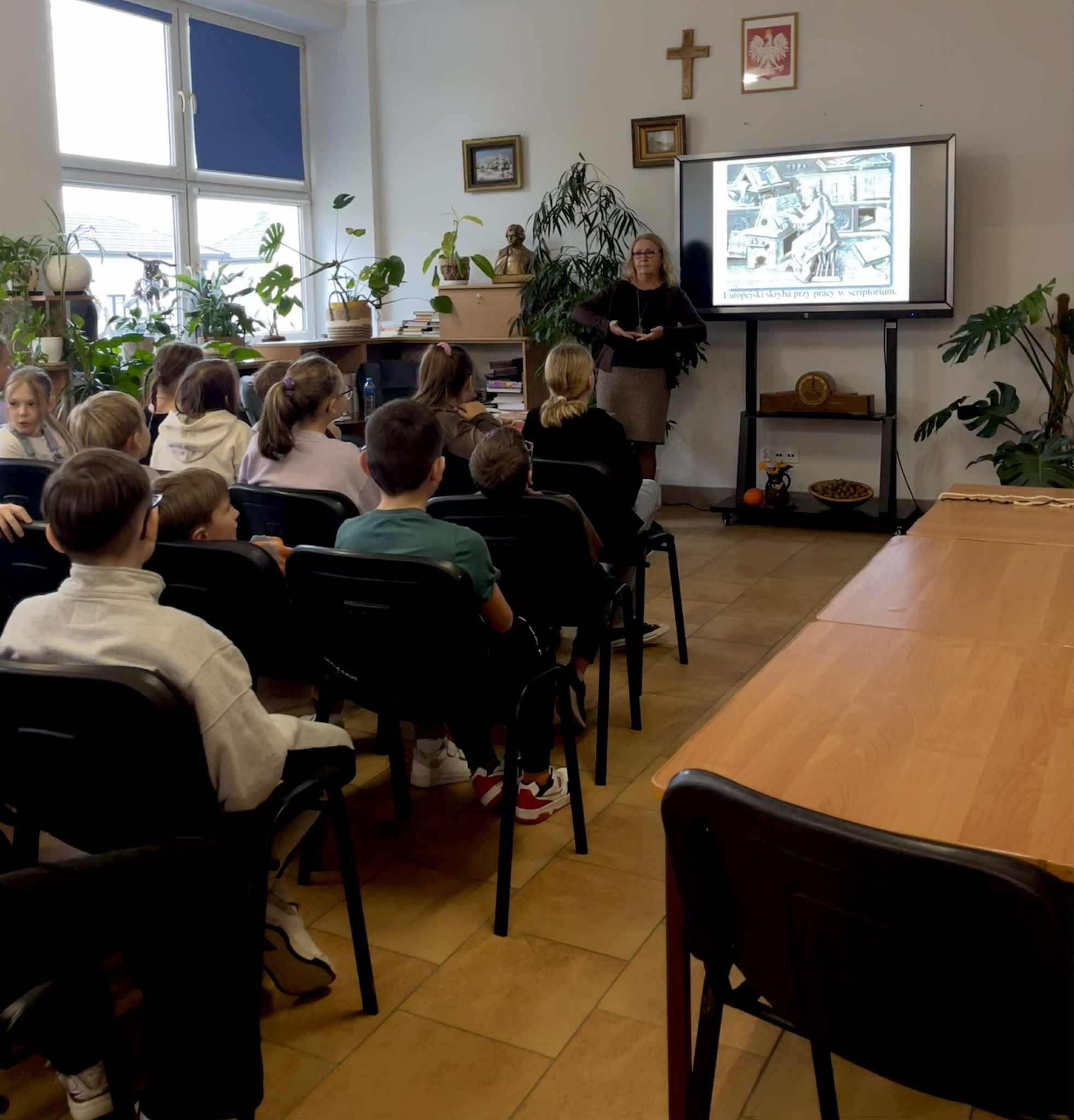 28 października 2025 roku klasa 4b uczestniczyła w w bibliotece szkolnej w zajęciach bibliotecznych pod nazwą „Historia książki”. Podczas zajęć, wspomaganych prezentacją komputerową oraz różnymi eksponatami, uczniowie poznali m.in. pismo supełkowe, dotykali "glinianej tabliczki" zapisanej pismem klinowym, pisali na tabliczkach woskowych, ćwiczyli korzystanie z książki w postaci zwoju, dotykali karty papirusowej, sprawdzili wytrzymałość papieru, ćwiczyli pisanie systemem Braille'a oraz oglądali książki napisane tym systemem.
