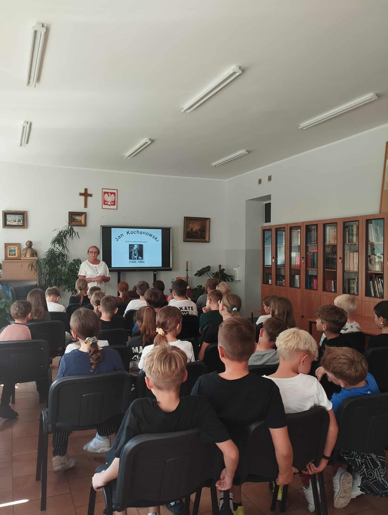 W dniu 12.09.2025 w bibliotece szkolnej odbyły się trzy lekcje poświęcone życiu i twórczości Jana Kochanowskiego, Patrona naszej szkoły, w których uczestniczyły uczniowie czterech klas czwartych. Zajęcia wspomagane były prezentacją komputerową.