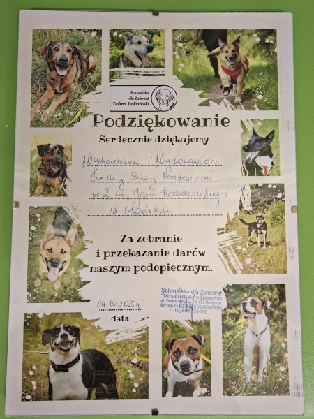 Wychowawcy świetlicy szkolnej składają podziękowania uczniom, rodzicom, pracownikom naszej placówki za wsparcie zbiórki karmy i innych artykułów dla zwierząt ze Schroniska "Dolina Dolistówki" w Białymstoku. Zgromadziliśmy spore ilości karmy, smakołyków , zabawek oraz innych akcesoriów dla psów i kotów. Po zakończeniu zbiórki, dary zostały przekazane do schroniska.