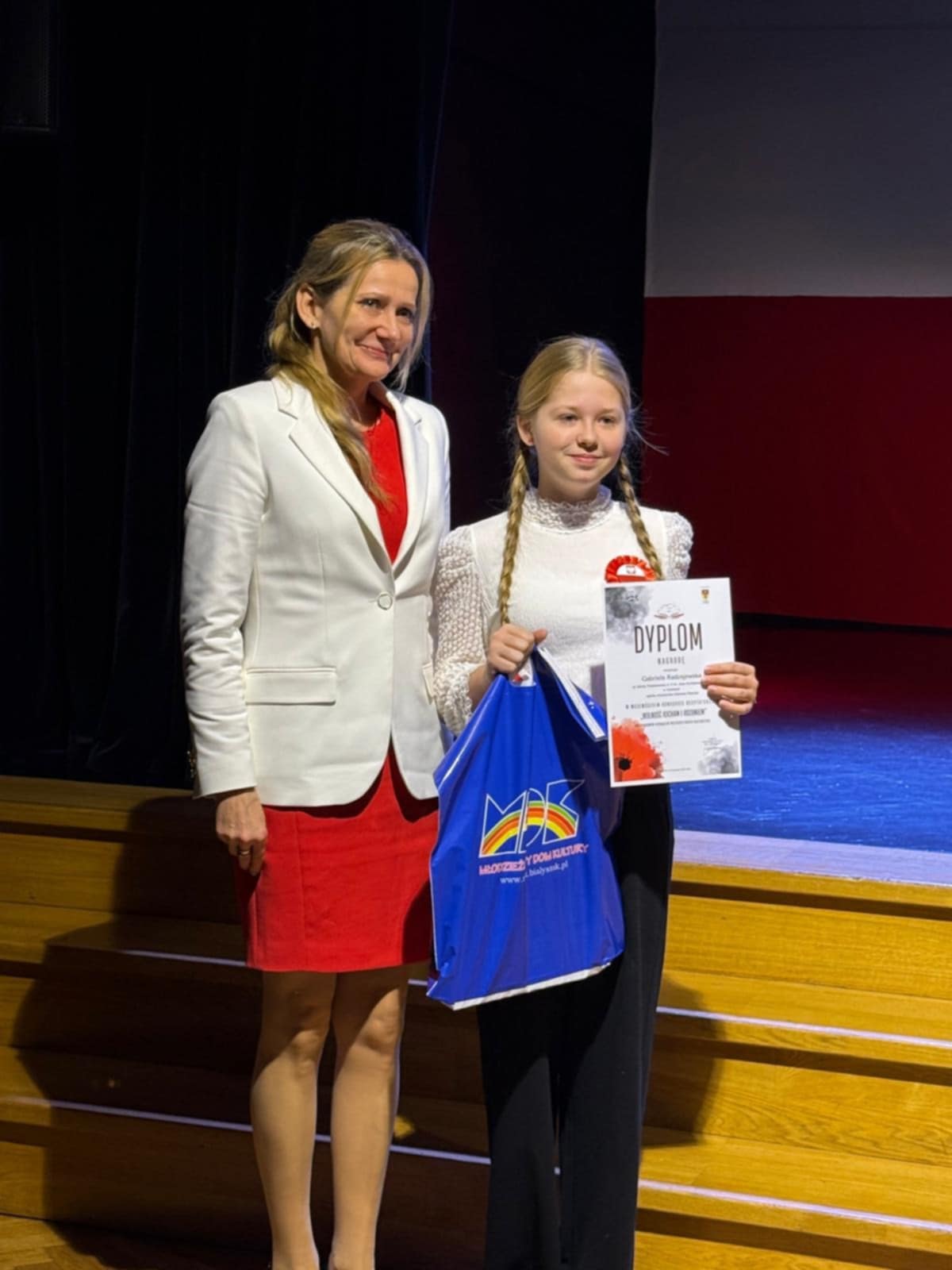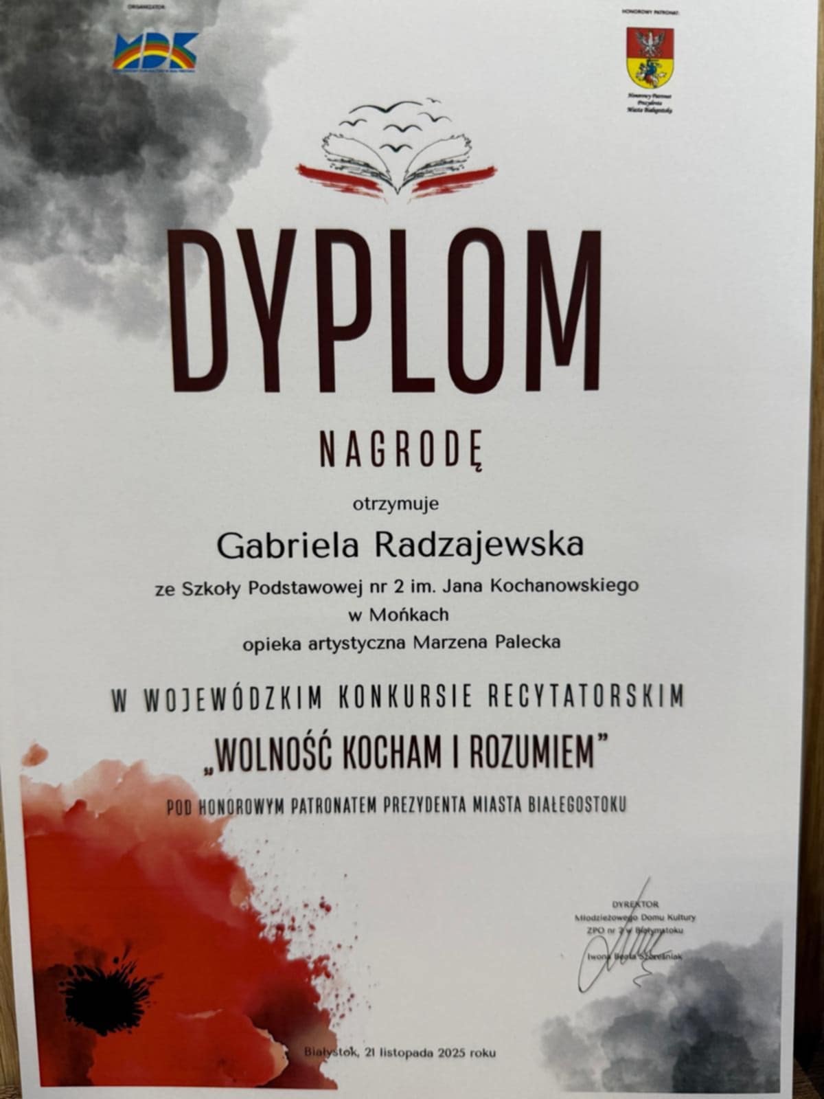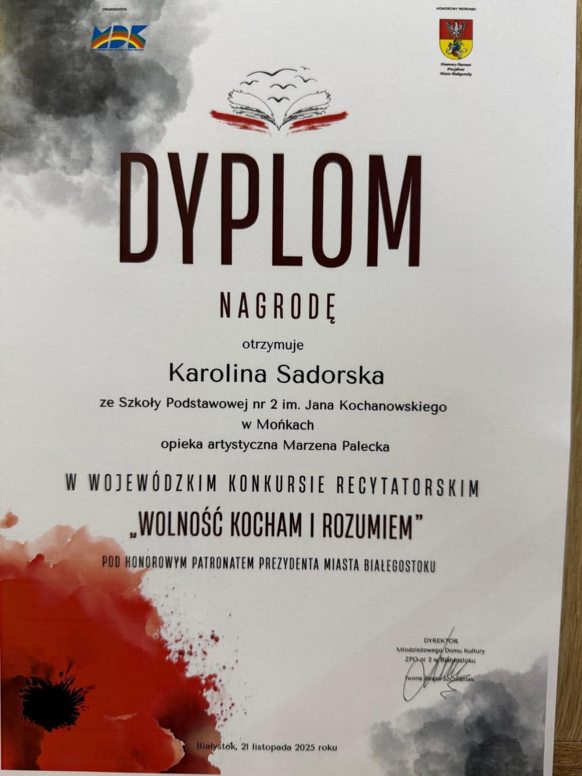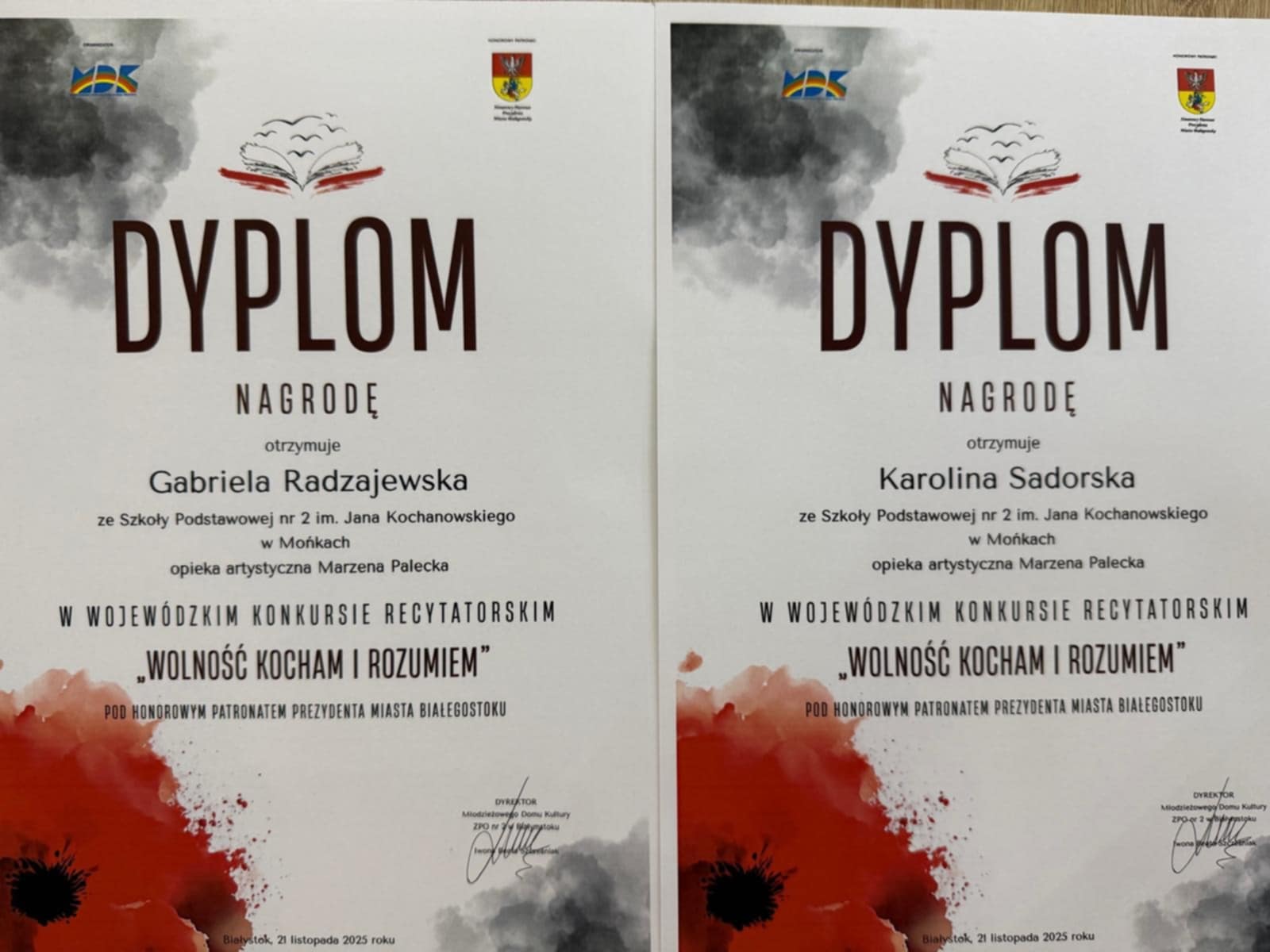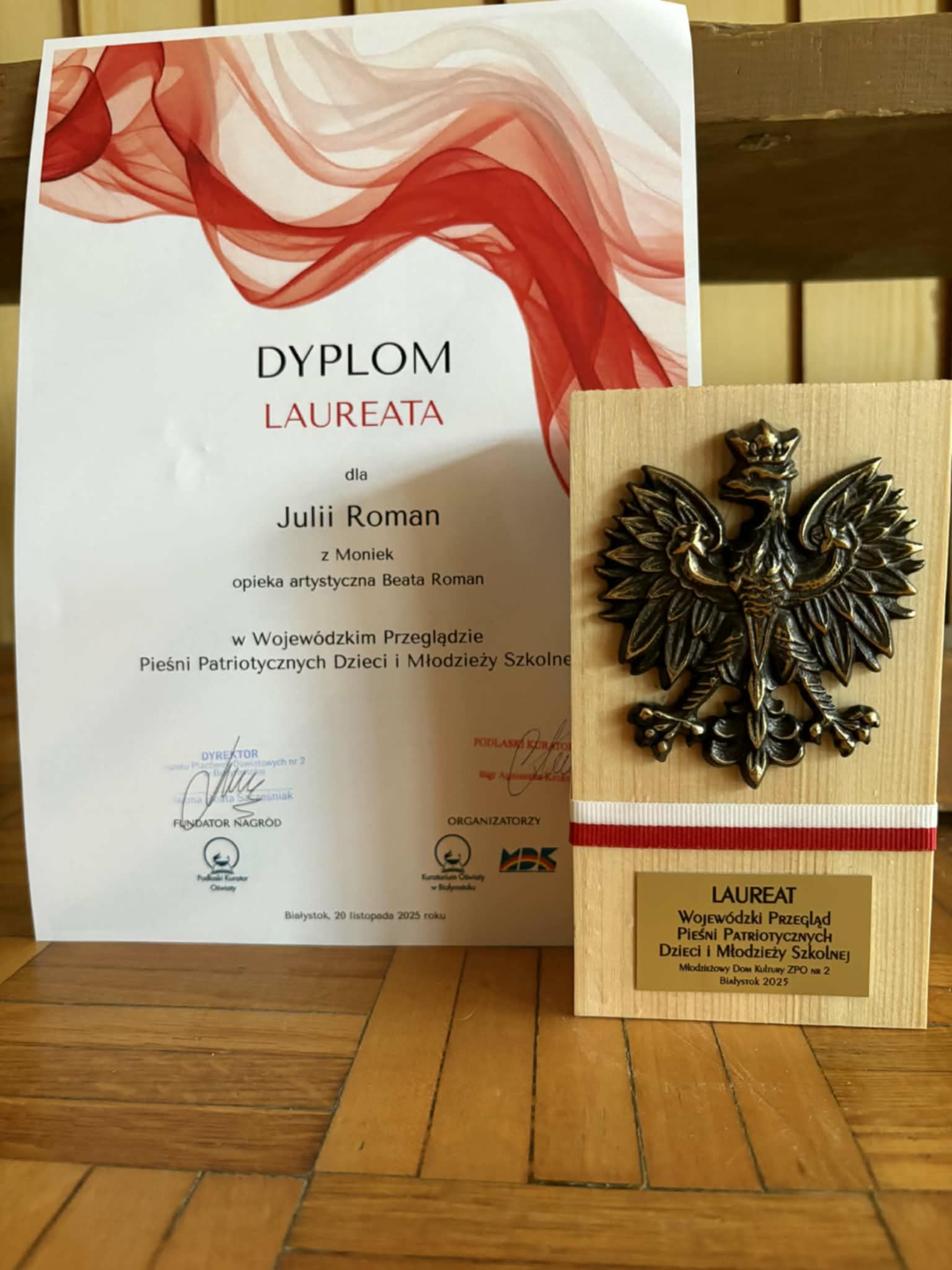 W Wojewódzkim Przeglądzie Pieśni Patriotycznych Dzieci i Młodzieży Szkolnej reprezentantki SP nr 2 w Mońkach - Julia Roman oraz Gabriela Radzajewska i Aleksandra Oświecińska - zachwyciły jury dojrzałym wykonaniem utworów, wzruszającą interpretacją oraz wysokim poziomem muzycznym. Zdobyte nagrody są wyrazem ich ogromnego talentu, systematycznej pracy oraz zaangażowania w pielęgnowanie wartości patriotycznych poprzez śpiew.