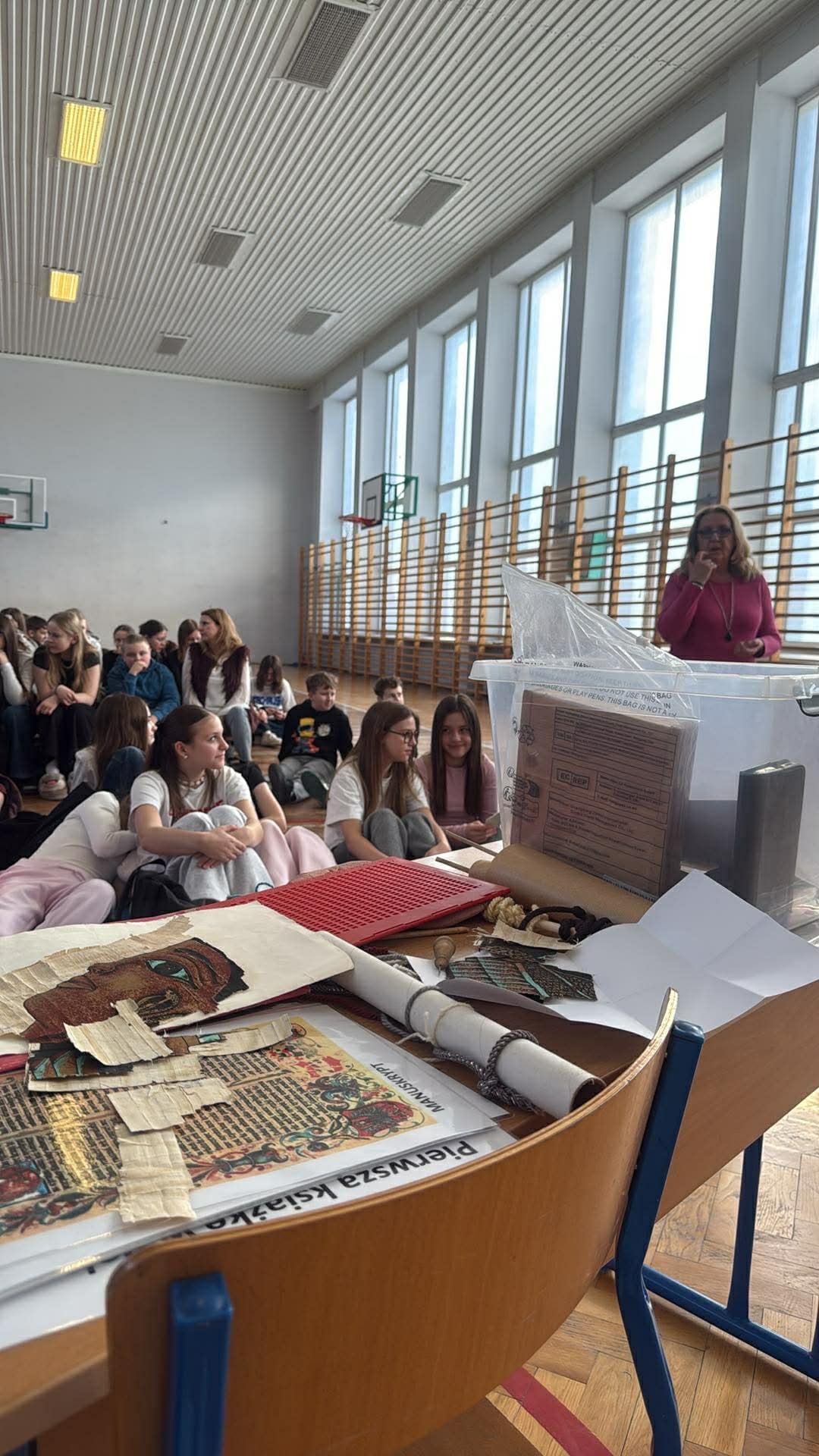 20 lutego 2006 roku uczniowie klas 8b, 7b, 7c, 6a, 6b, 6c, 5d, 4d uczestniczyli w sali gimnastycznej w zajęciach bibliotecznych pod nazwą „Historia książki”. Zajęcia wspomagane były, prezentacją komputerową oraz różnymi rekwizytami. Podczas ich trwania uczniowie obejrzeli "gliniane tabliczki" zapisane pismem klinowym, pisali na tabliczkach woskowych, ćwiczyli korzystanie z książki w postaci zwoju, porównywali wytrzymałość karty papirusowej z wytrzymałością karty papierowej, ćwiczyli pisanie systemem Braille'a oraz oglądali książki napisane w tym systemie.