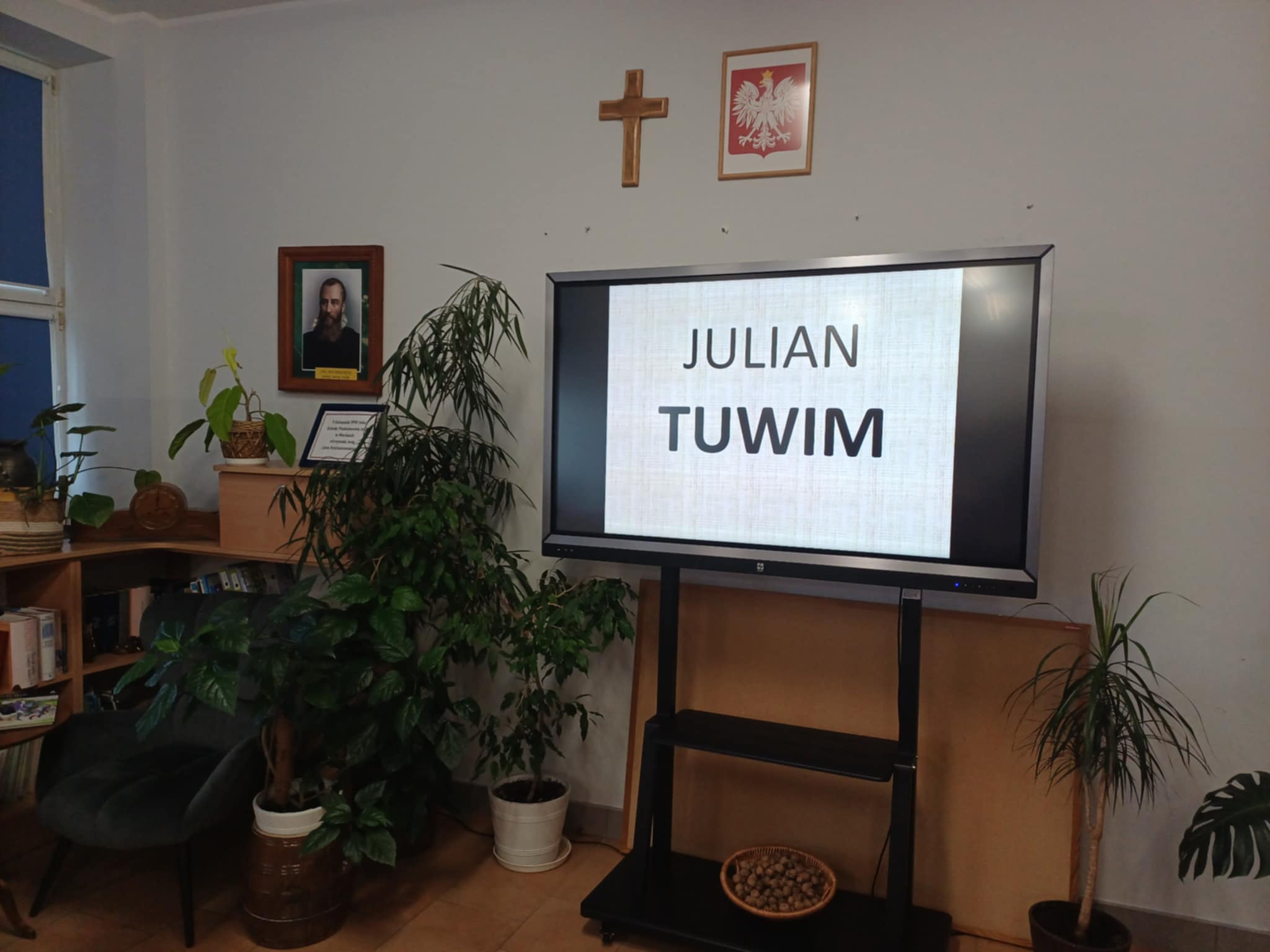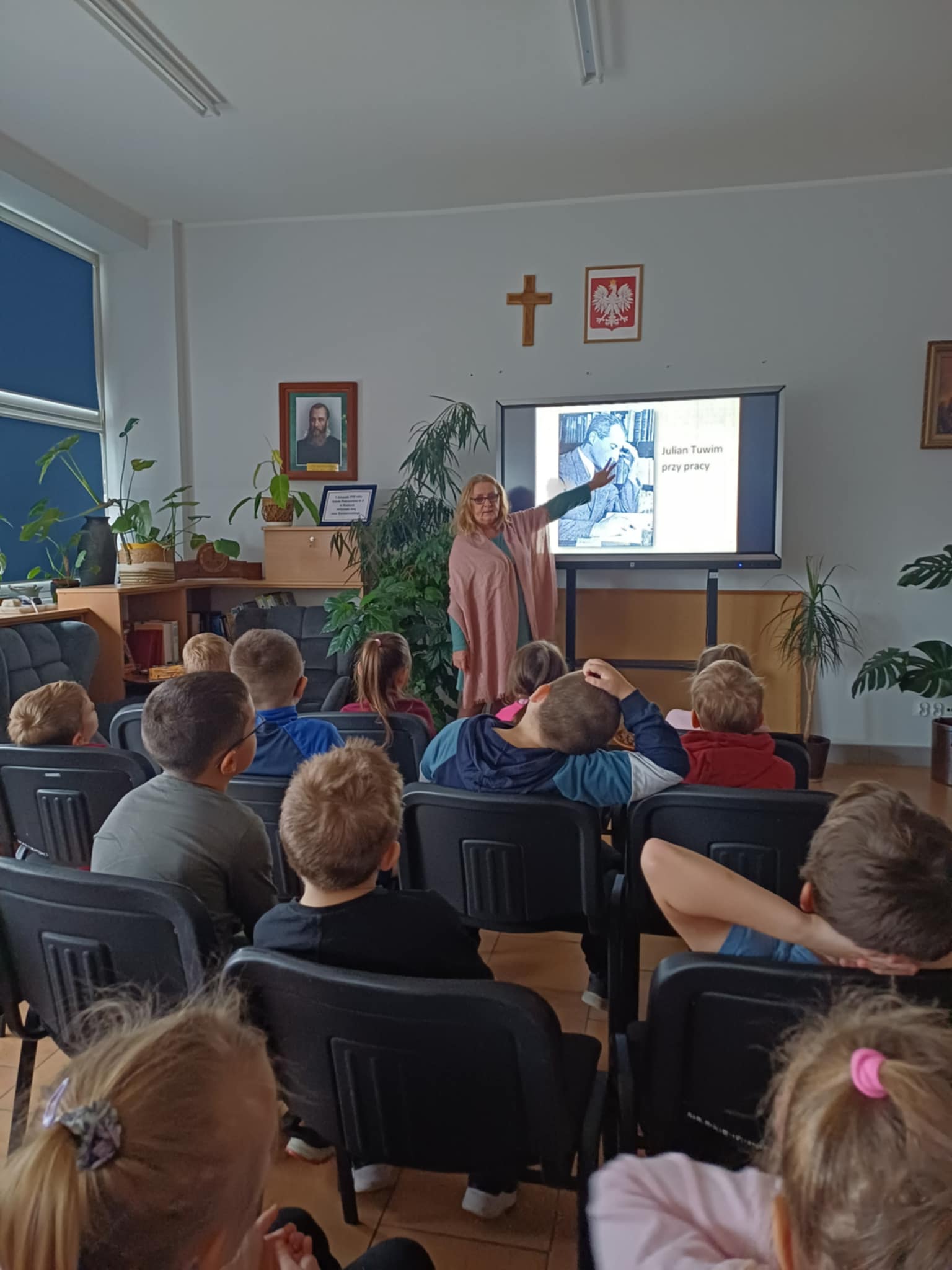 Podczas zajęć pani bibliotekarka opowiadała uczniom o pasjach Juliana Tuwima oraz głośno przeczytała wiersze jego autorstwa. Zajęcia wspomagane były prezentacją komputerową przygotowaną w oparciu o książkę Agnieszki Frączek pod tytułem „Rany Julek! O tym, jak Julian Tuwim został poetą”.