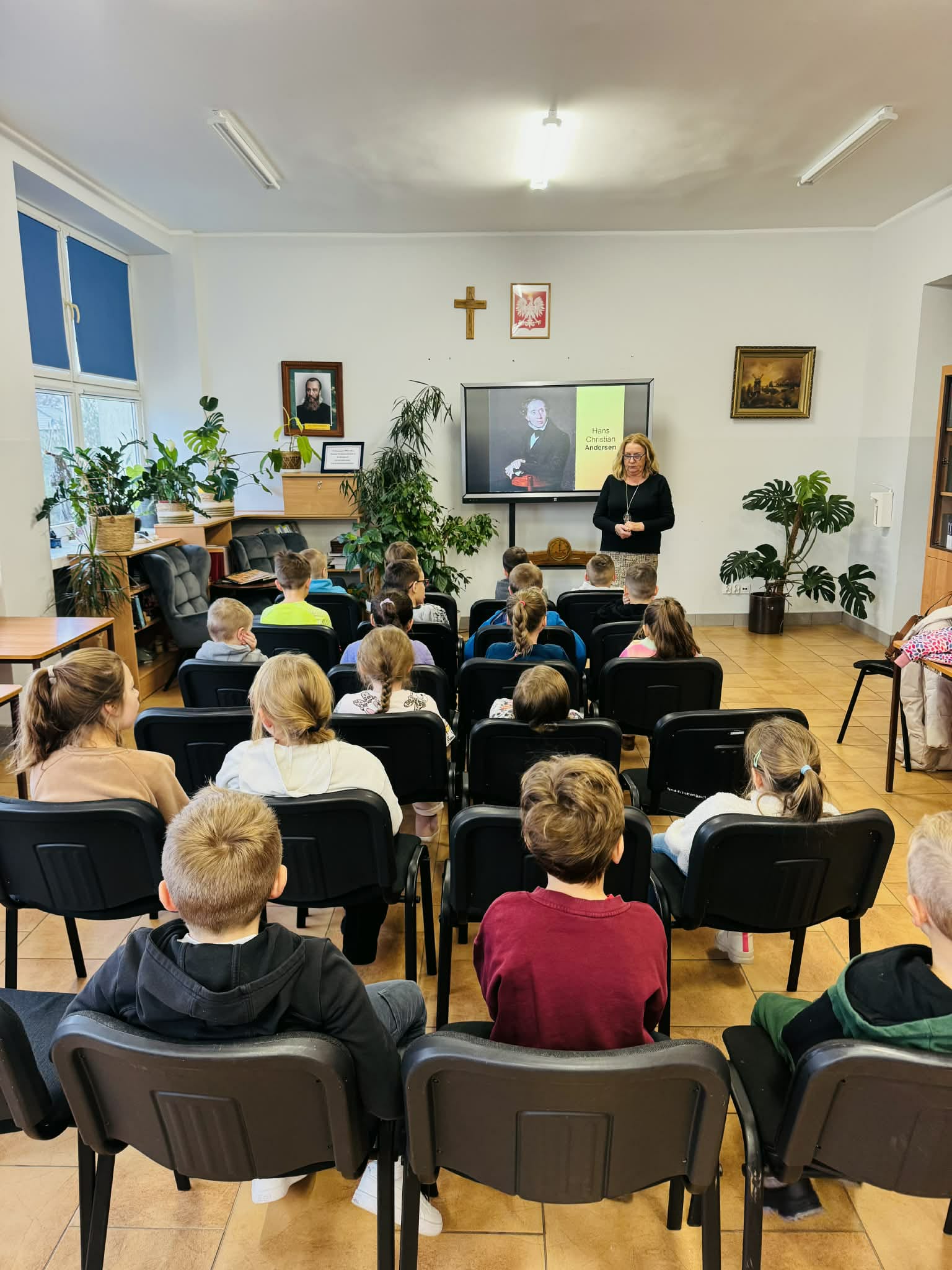 21 listopada 2025 roku uczniowie klas 1 d odwiedzili bibliotekę szkolną przy ulicy Leśnej w celu wzięcia udziału w zajęciach pod nazwą „W poszukiwaniu szczęścia”. Pierwszoklasiści wysłuchali opowieści o życiu i twórczości Hansa Christiana Andersena. Zajęcia wspomagane były prezentacją multimedialną opracowaną na podstawie książki Wioletty Piaseckiej: "W poszukiwaniu szczęścia. Baśniowa biografia Andersena".