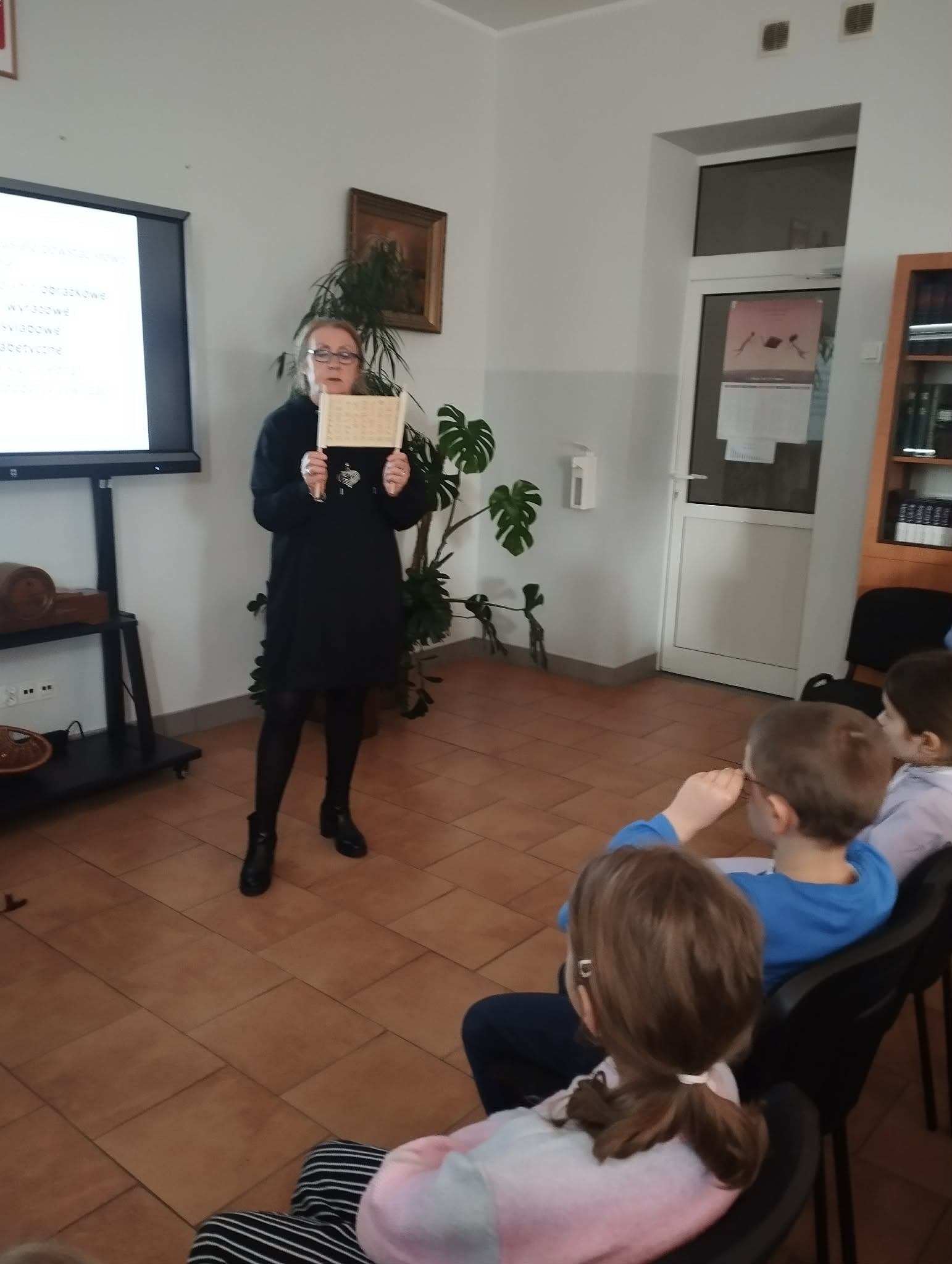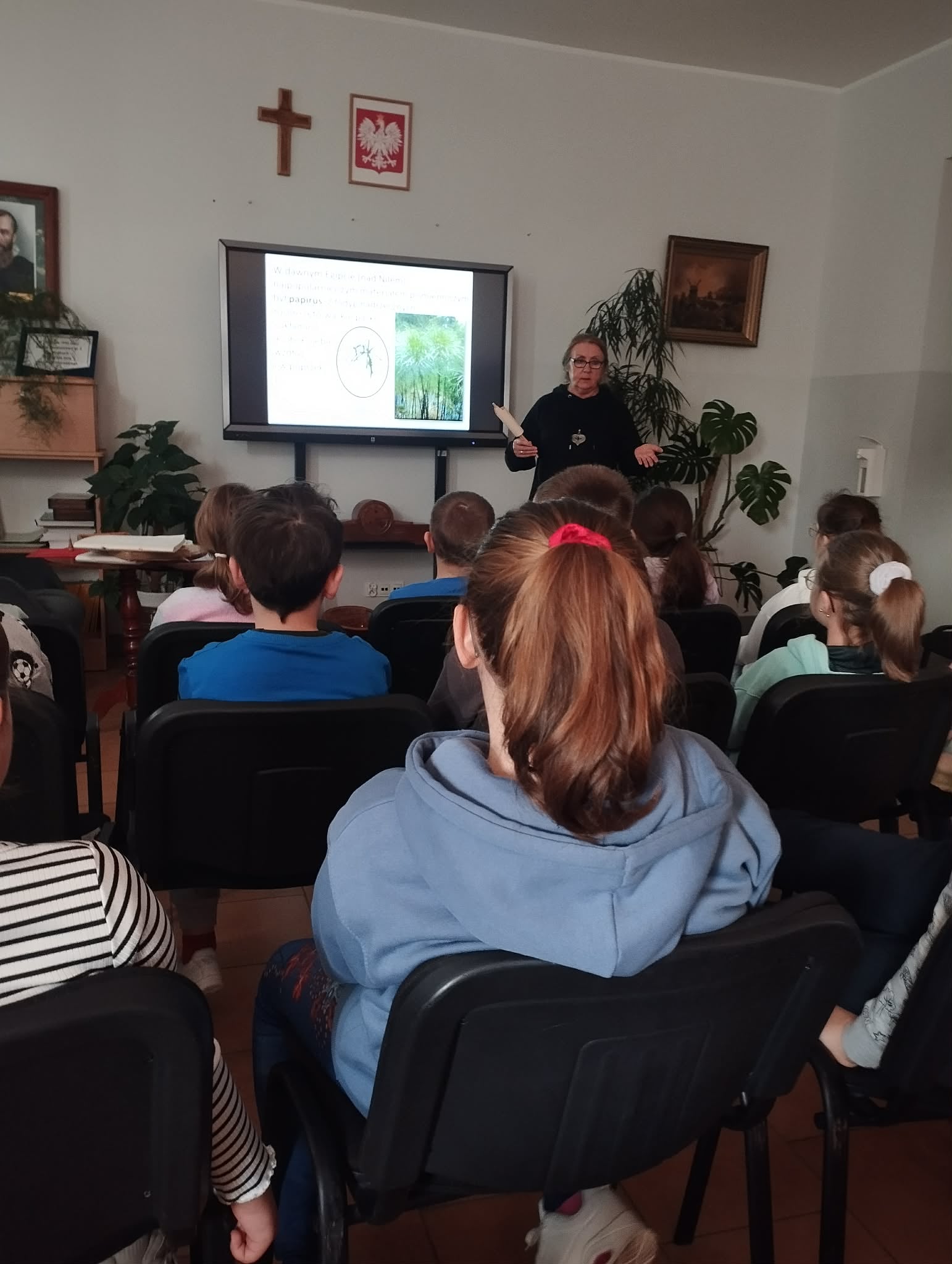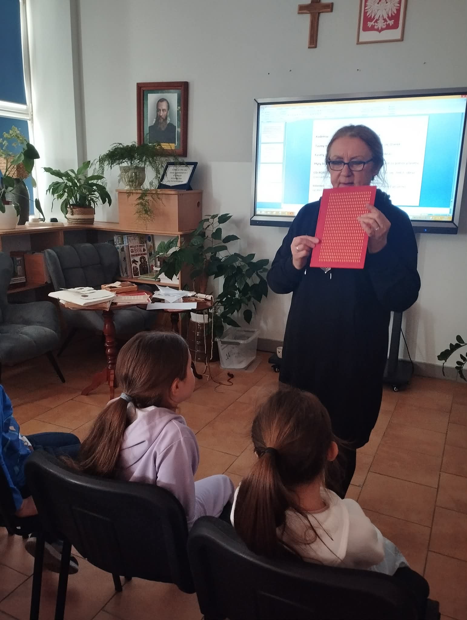 Zajęcia wspomagane były, prezentacją komputerową demonstrującą zdjęcia dawnych książek oraz różnymi rekwizytami. Uczniowie obejrzeli "gliniane tabliczki" zapisane pismem klinowym, pisali na tabliczkach woskowych, ćwiczyli korzystanie z książki w postaci zwoju, porównywali wytrzymałość karty papirusowej z wytrzymałością karty papierowej, ćwiczyli pisanie systemem Braille'a oraz oglądali książki napisane w tym systemie.