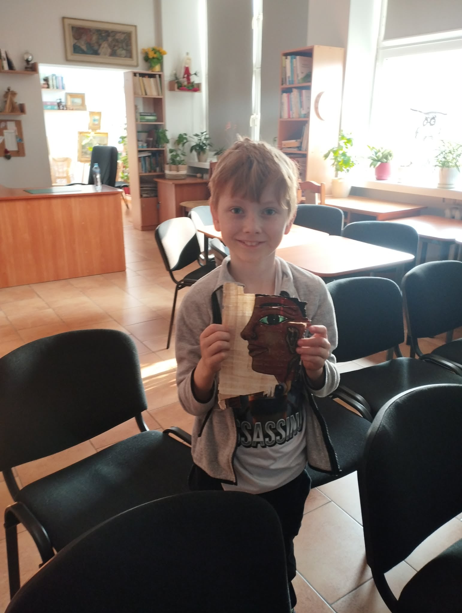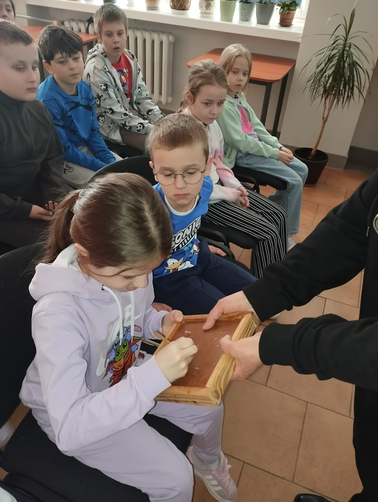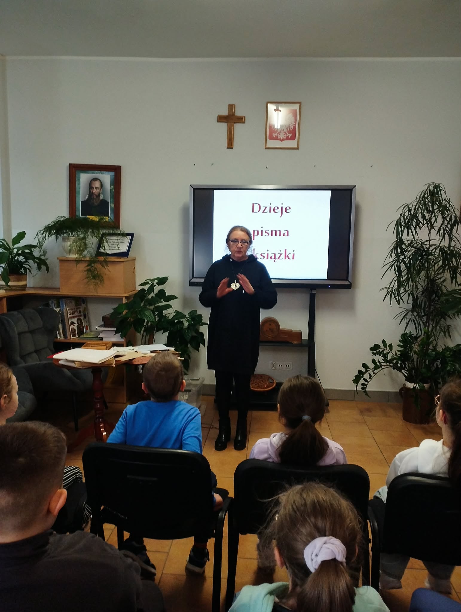 Zajęcia wspomagane były, prezentacją komputerową demonstrującą zdjęcia dawnych książek oraz różnymi rekwizytami. Uczniowie obejrzeli "gliniane tabliczki" zapisane pismem klinowym, pisali na tabliczkach woskowych, ćwiczyli korzystanie z książki w postaci zwoju, porównywali wytrzymałość karty papirusowej z wytrzymałością karty papierowej, ćwiczyli pisanie systemem Braille'a oraz oglądali książki napisane w tym systemie.